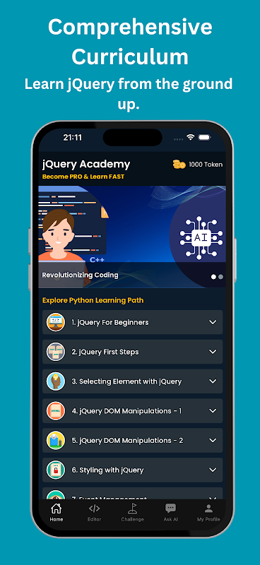 Apprendimento basato sull'intelligenza artificiale: con l'intelligenza artificiale integrata nell'app, jQuery Academy adatta le lezioni al tuo livello di abilità. Che tu sia un principiante assoluto o un programmatore esperto, l'app si adatta alle tue esigenze, fornendo spiegazioni, correzioni e suggerimenti per guidarti attraverso il tuo percorso di apprendimento.