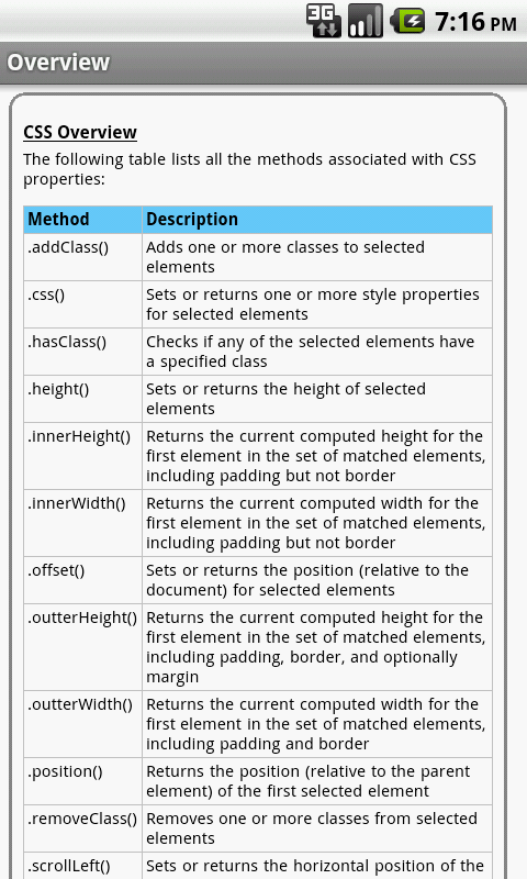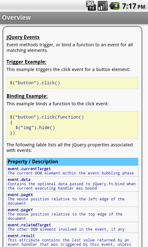 Le proprietà jQuery / funzioni / metodi sono suddivisi in categorie e ricercabili. Ogni schermata delle informazioni dettagliate contiene una descrizione, i parametri, gli esempi, la compatibilità del browser, e altro ancora. Inoltre, la maggior parte degli esempi includono l'uscita effettiva.