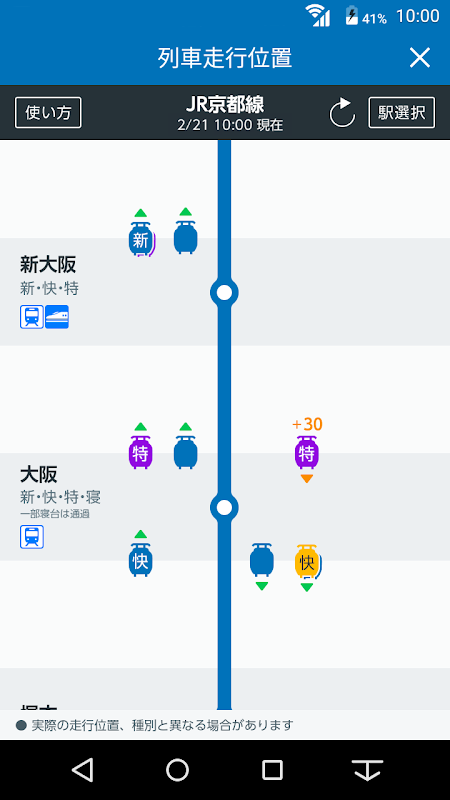 Per le linee convenzionali, i treni espressi limitati e Shinkansens all'interno della giurisdizione di JR West, vi è un ritardo di oltre 15 minuti per più treni sulla rotta registrata dal cliente (più di 10 minuti per l'ora di punta mattutina nell'area di Keihanshin, Sanyo Shinkansen e Hokuriku Shinkansen) Ti informeremo delle informazioni sull'operazione tramite notifica push quando si verifica o è previsto. Oltre al percorso, all'ora e allo stato di guida, se puoi controllare lo stato, puoi anche controllare la sezione interessata, la causa, il tempo di ripresa stimato quando la guida è sospesa e l'implementazione del trasferimento di trasferimento. Inoltre, è possibile controllare la posizione di marcia dei singoli treni su alcuni percorsi.
