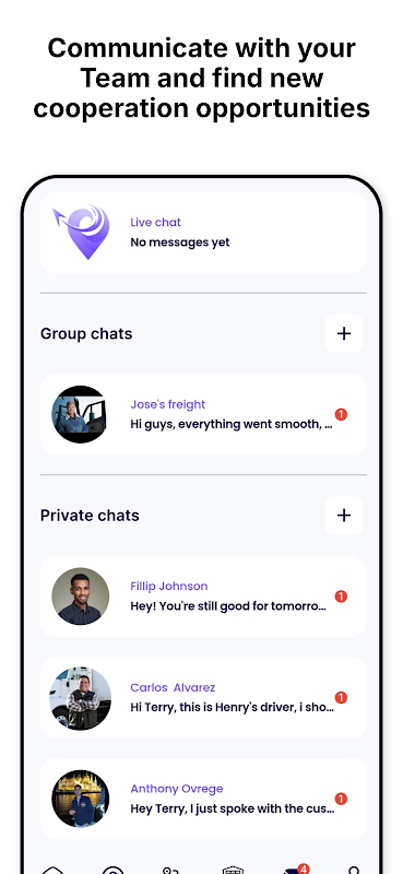 Comunica con spedizionieri, autisti e partner in tempo reale. Crea chat private o gruppi pubblici per rimanere organizzato e connesso.