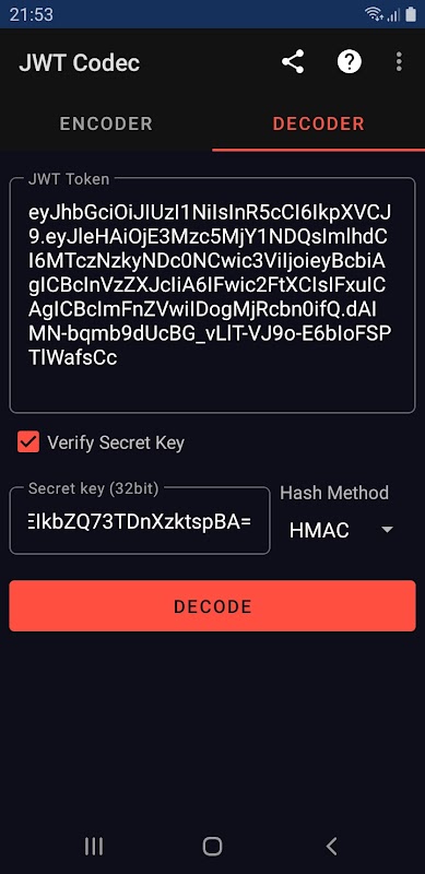 JWT Codec fornisce un'interfaccia intuitiva per codificare e decodificare facilmente i JWT. Puoi facilmente ispezionare il payload del token, verificarne la firma e generare nuovi token con chiavi segrete. Che tu sia uno sviluppatore, un professionista della sicurezza o semplicemente curioso dei JWT, questa app è uno strumento prezioso per comprendere e lavorare con la tecnologia jwt.