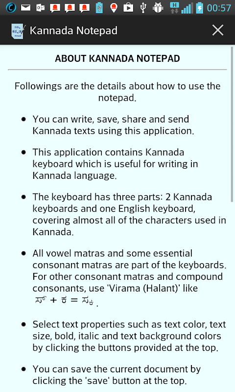 You can write, save, share and send Kannada texts using Kannada Notepad.