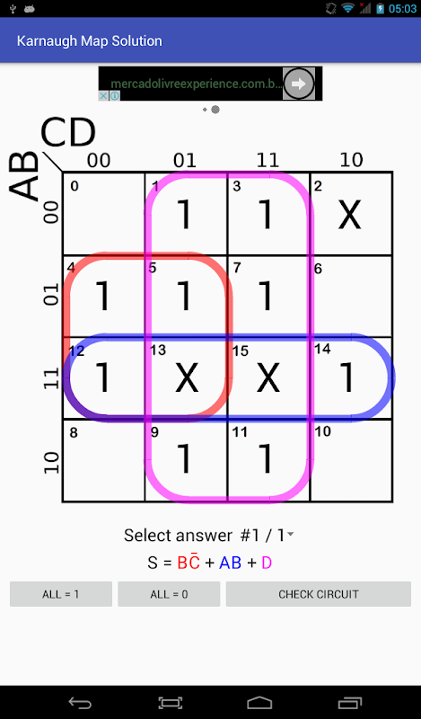 Questa applicazione risolve Karnaugh Map, chiamata anche Kmap, per 2, 3, 4 o 5 variabili. È l'unica applicazione che conosco che fornirà (e mostrerà su Kmap) TUTTE le possibili soluzioni kmap. Mostrerà anche quattro diverse versioni di un circuito logico di uscita ottimizzato: una versione tradizionale, un circuito con inverter comuni e un circuito solo NAND/NOR.