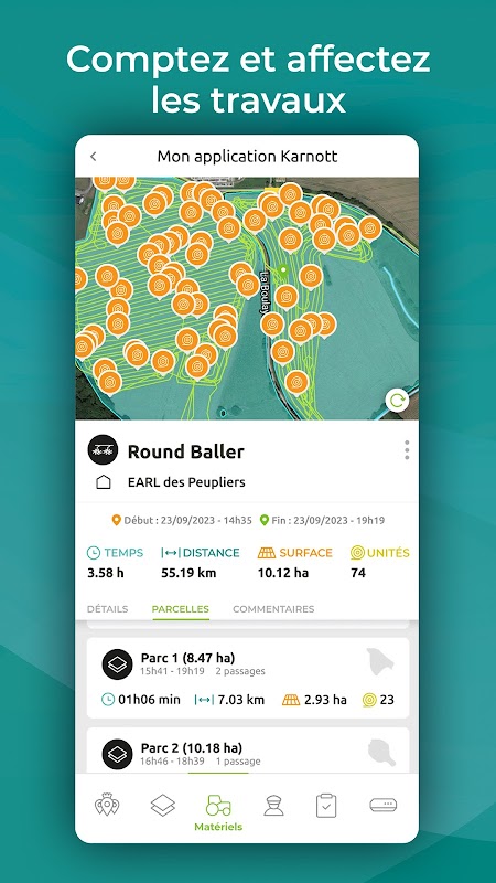 Aratura, semina, raccolta, coltivazione delle stoppie, diffusione, falciatura, pressatura, ... Karnott registra automaticamente tutte le attività.