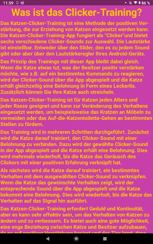 Cat Clicker Training Light - Allena il comportamento desiderato con Cat Clicker Training Light e impedisci al tuo gatto di comportarsi indesiderato con questo addestramento mirato. In questa versione light ci sono tre diversi toni clicker, la versione premium contiene sei toni clicker. Questa versione leggera ha due profili di gatto (diari di successo), la versione premium ha dieci profili di gatto. Decidi tu stesso se la versione light è sufficiente per te o se preferisci passare alla versione premium.