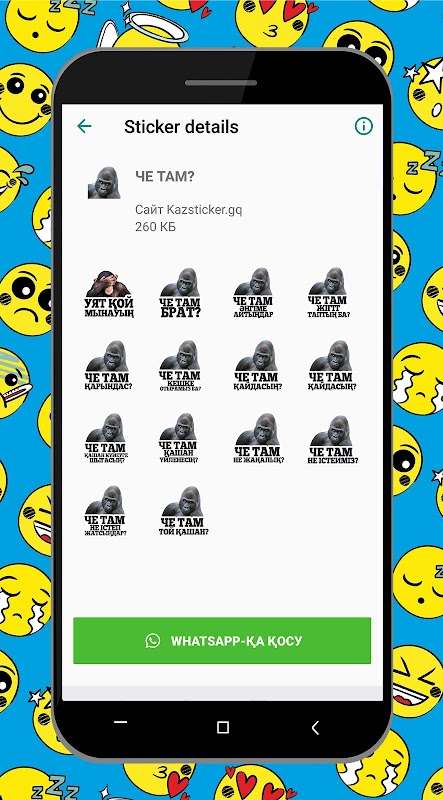 ұнайтын әртүрлі тақырыптағы Стикерлер орнатылған. Орнатып алып WhatsApp-та оңай қолданыңыз! Егер өзіңіз қосықыңыз келген ұсыныстарыңыз немесе ұнамай қалған жерлері болса