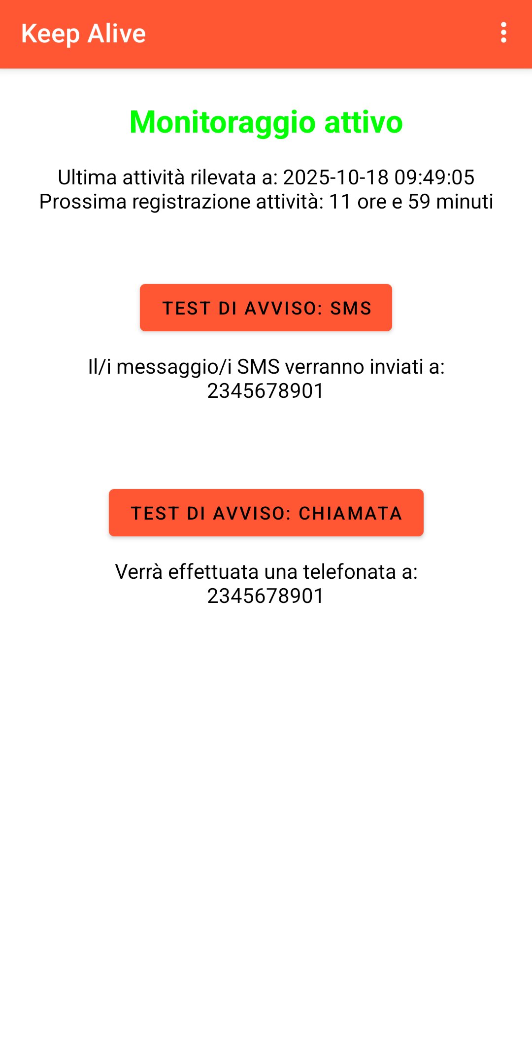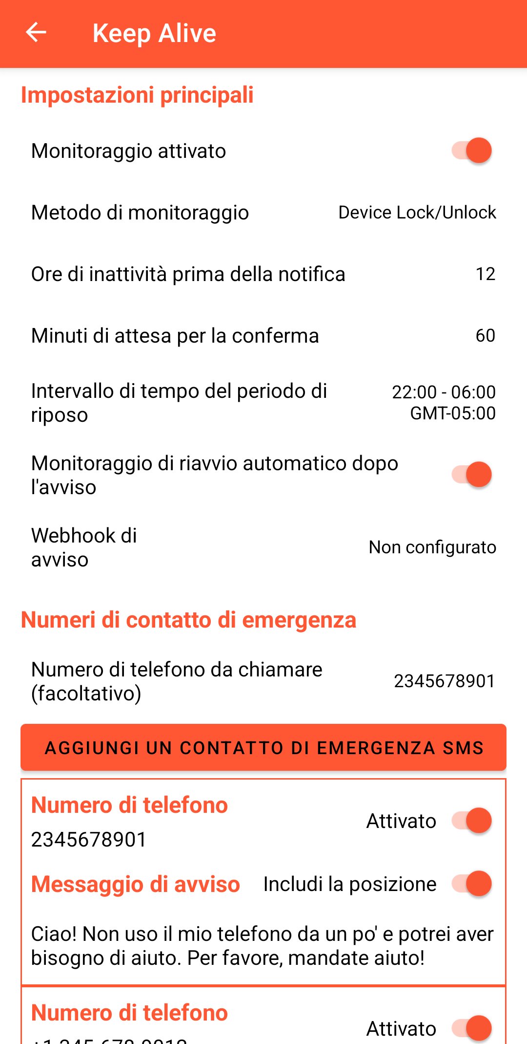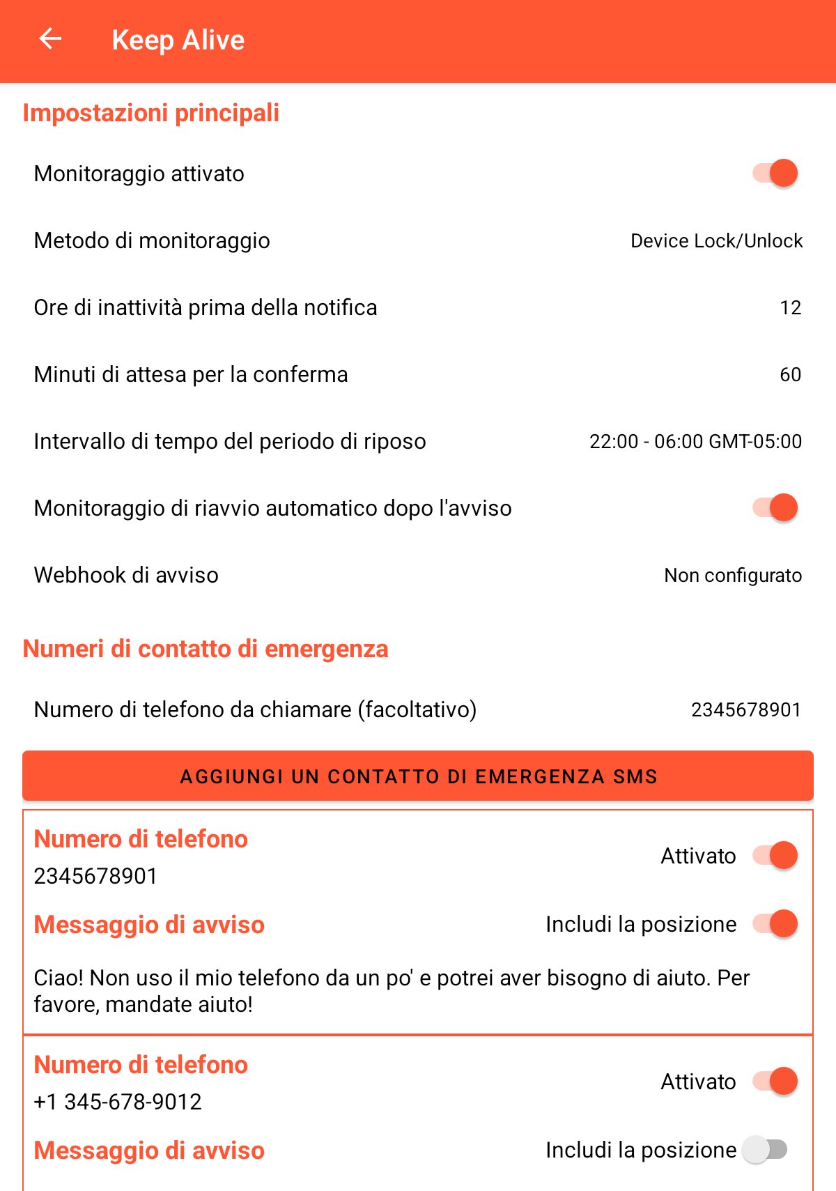 Non vengono raccolti dati diversi dalle impostazioni configurate. Tali dati non vengono condivisi con gli sviluppatori né con terze parti. L’unica comunicazione avviene verso i contatti di emergenza configurati. L’app non richiede accesso a rete o archiviazione e non trasmette dati agli sviluppatori o a terzi.