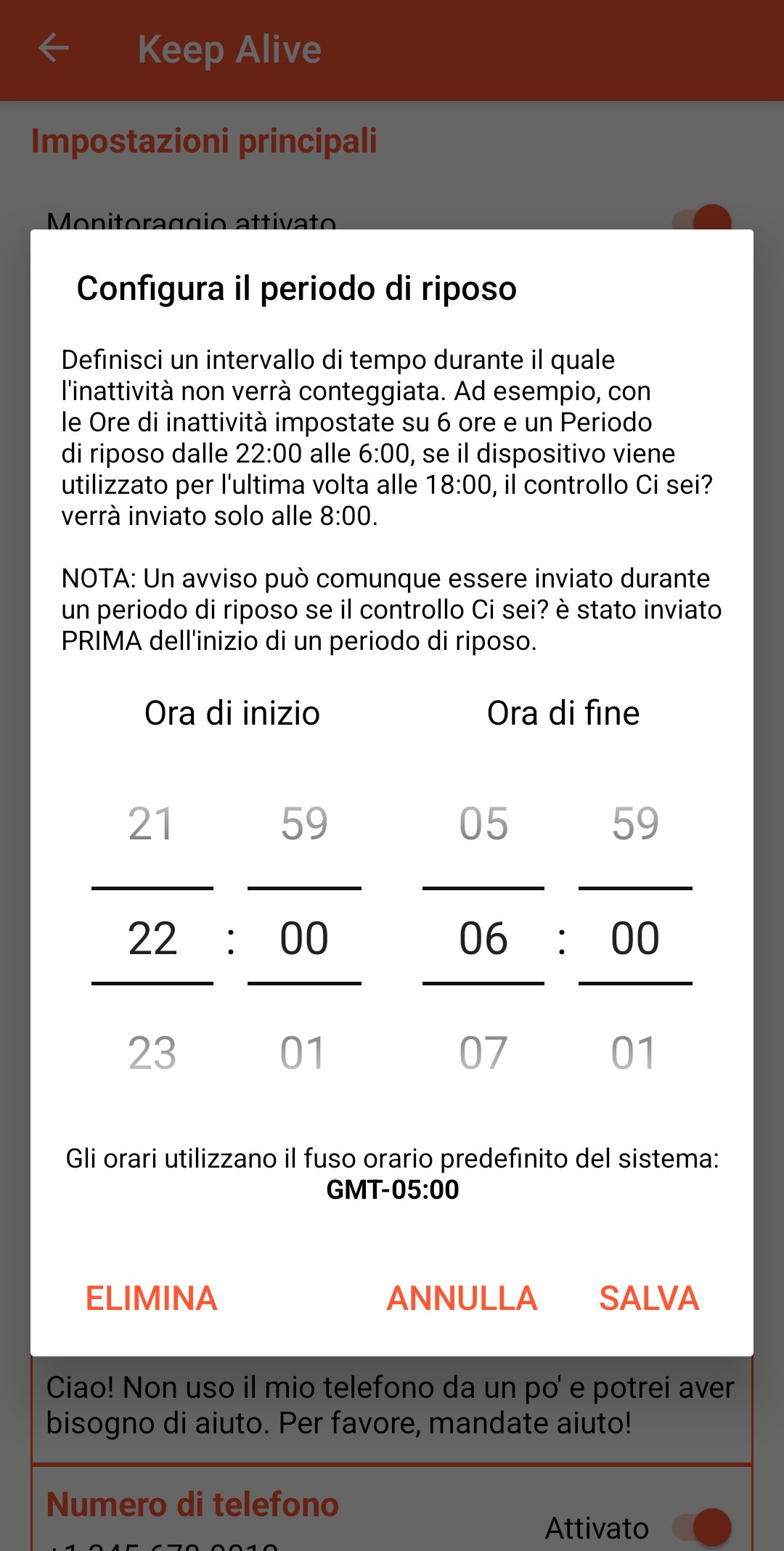 - Intervallo di riposo: fascia oraria in cui l’inattività non viene conteggiata (es. 22:00-6:00). Gli avvisi già iniziati prima del periodo di riposo possono comunque essere inviati.