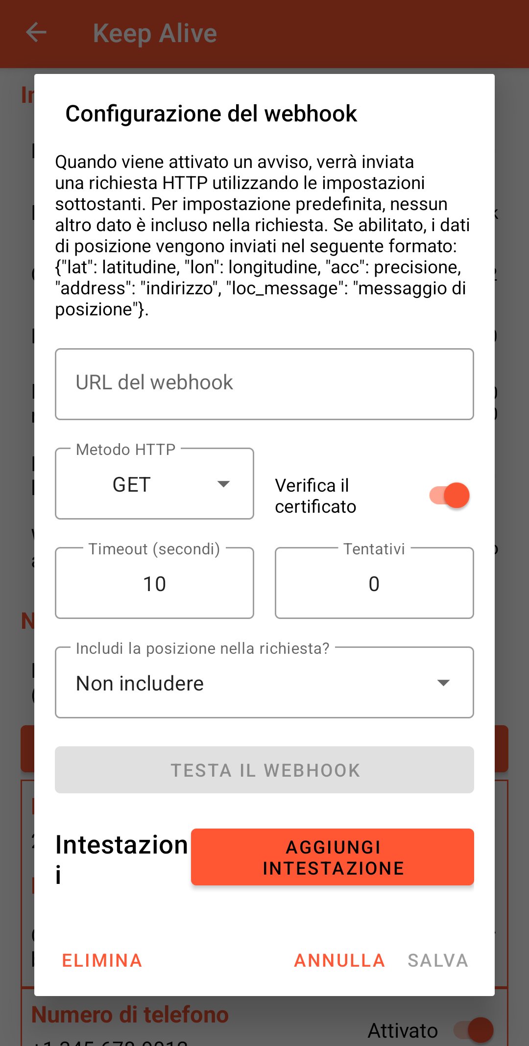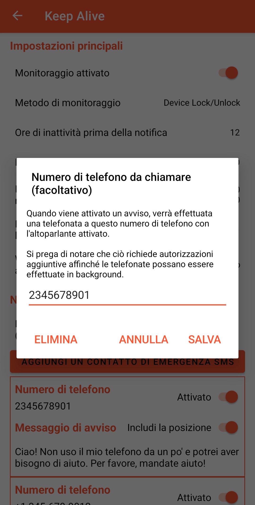- Numero di chiamata (facoltativo): alla ricezione di un Avviso verrà effettuata una chiamata a questo numero con vivavoce attivo.