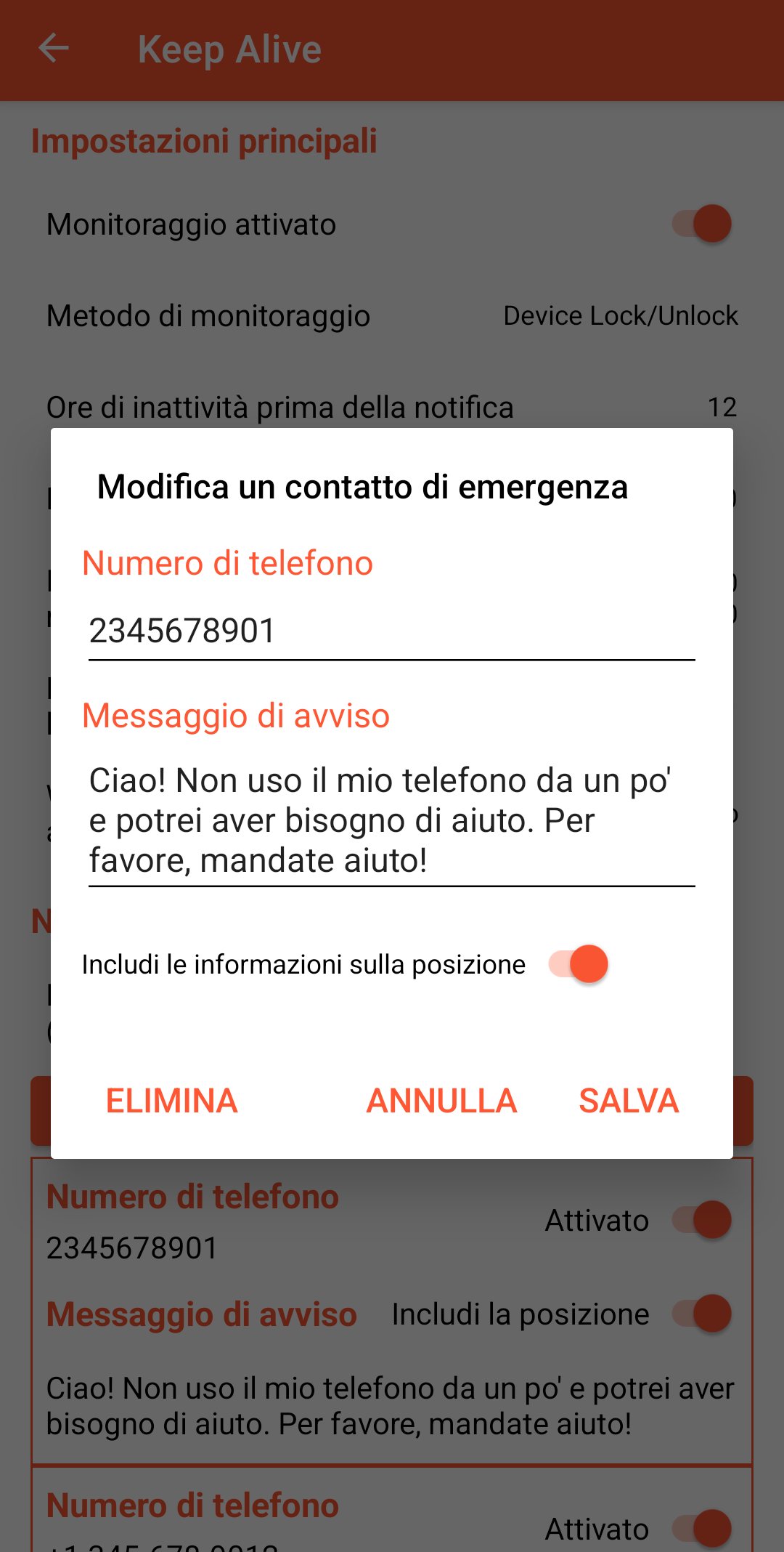 - Includi posizione: se attivo, verrà inviato un secondo SMS con la posizione