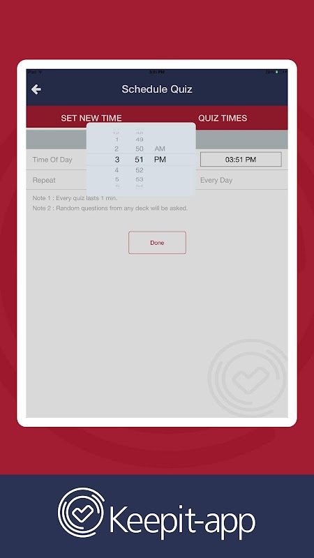 L'applicazione mobile KeepItApp può aiutare a guardare in alto, rivedere, provare e cercare quello che hai imparato e si smette di dimenticare preziose informazioni in tal modo. Essa vi aiuterà a imparare, ricordare e applicare il vostro materiale. Come? Le informazioni o il contenuto della vostra formazione, laboratori e seminari saranno convertite in domande. L'utente può quindi decidere quando e quanto spesso l'applicazione lo quiz su queste questioni. In entrambi i casi di default (raccomandazione di formatore), modalità intensiva, o semplicemente provare i fatti principali. Una volta alla settimana, ogni giorno o su base mensile, come si desidera. L'applicazione può anche mescolare il contenuto o diverse serie di domande che lo rendono più esigente. Inoltre, è dotato di molteplici servizi per soddisfare il vostro bisogno particolare: da "snooze", a "ricordare a-me" o "lettura ad alta voce", in macchina, in aereo, in treno, in una sala d'attesa o hall.