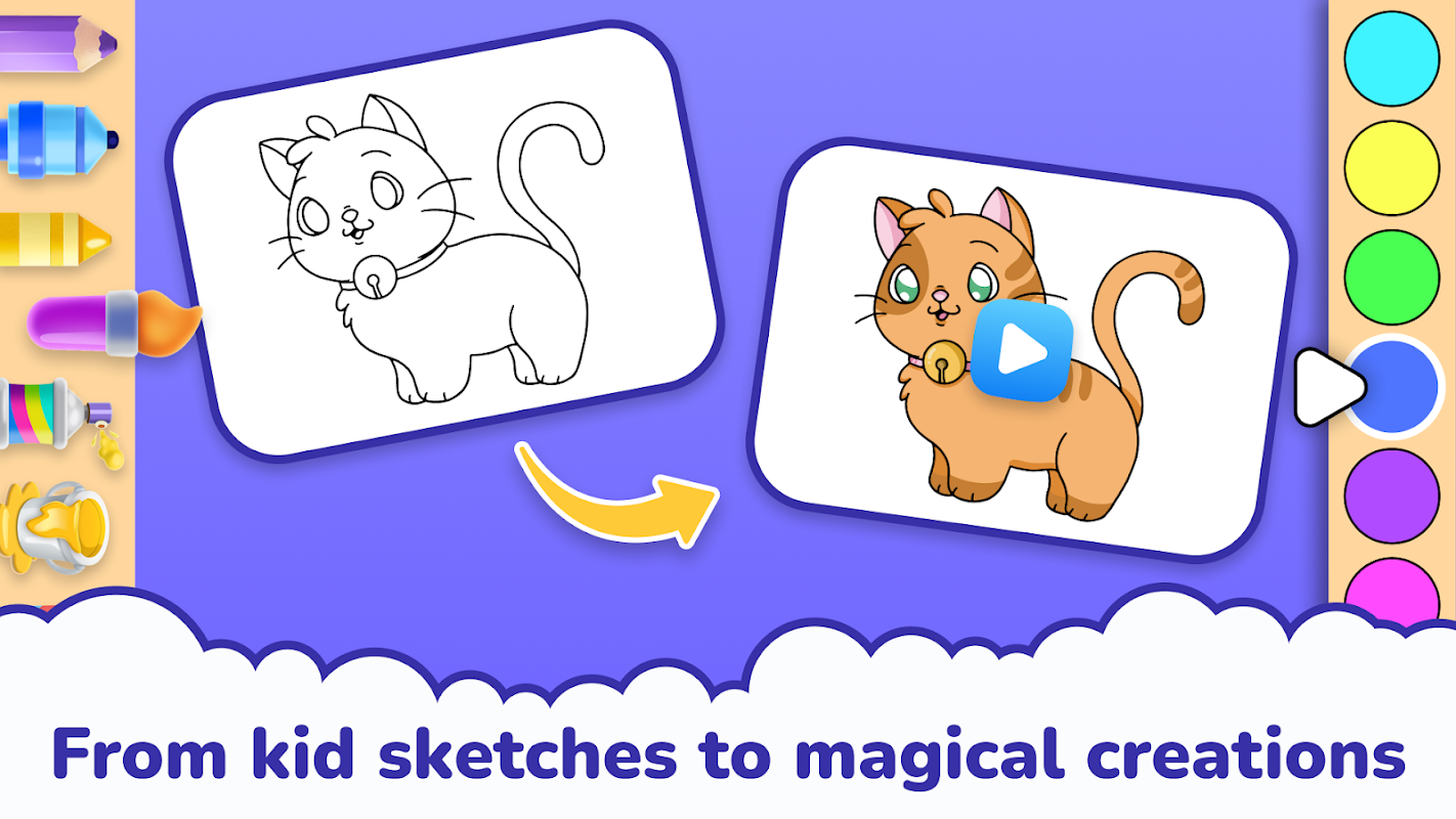 Con Kids Coloring & AI Drawing i bambini possono disegnare, colorare e vedere la loro arte prendere vita, con un pizzico di magia dell'intelligenza artificiale! Non è solo un libro da colorare, è un'avventura creativa in cui ogni scarabocchio prende vita.