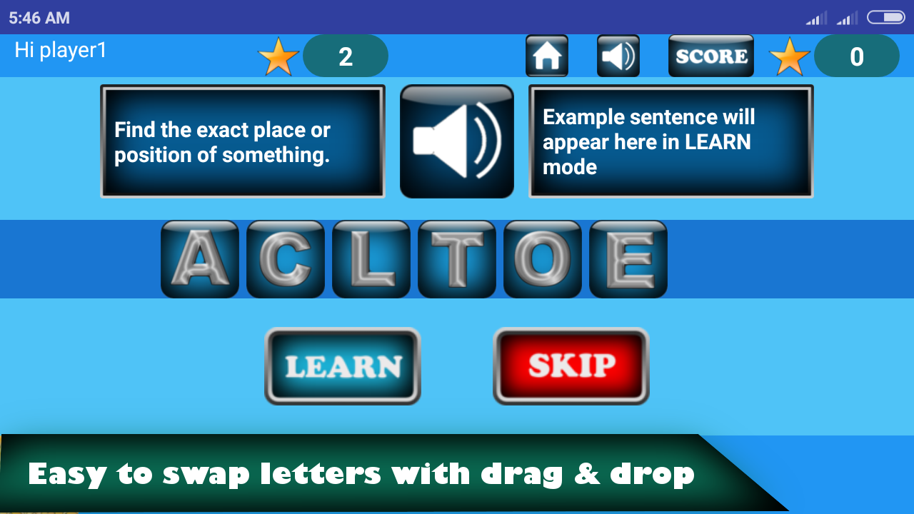 A free and easy to play spelling game to learn English verbs. Learn meaning of each word along with a example sentence. This is the second game in the verbs series with 500 verbs to learn. All the 500 words are free to play in the missing letter mode. Kids can also learn the unknown words very easily with this Lean and Play verbs game with the learn option for each word. The jumbled letter game mode is fun to play by swapping the letters to frame the correct word.
