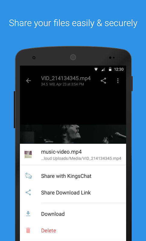 KingsCloud è la nuova sede per tutte le vostre foto, documenti, video e altri file! I file si mantiene in KingsCloud vengono memorizzati in modo sicuro nel cloud e sono accessibili da tutti i dispositivi. Inoltre, è un modo intuitivo semplice per visualizzare tutti i contenuti multimediali che avete condiviso via KingsChat.