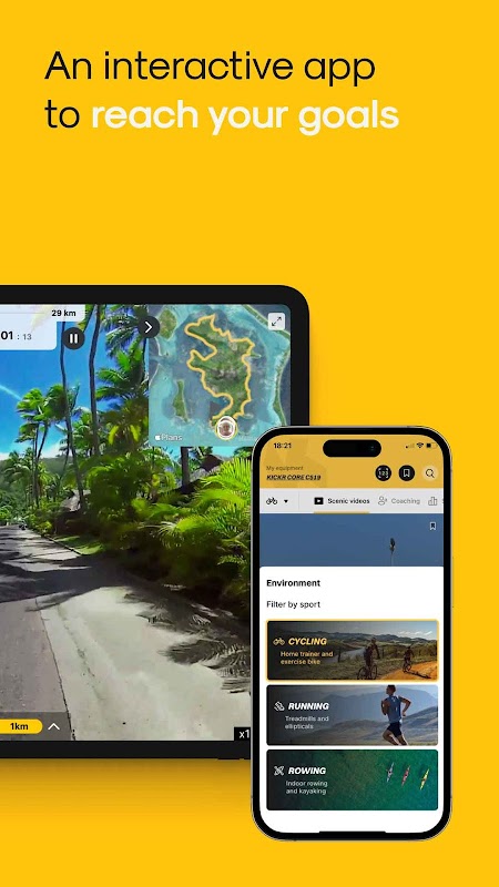 Kinomap è un'applicazione interattiva per l'allenamento indoor per ciclismo, corsa, camminata e canottaggio, compatibile con cyclette, home trainer, tapis roulant, ellittica o vogatore. L'applicazione fornisce l'accesso alla più grande piattaforma di condivisione video geolocalizzata con migliaia di percorsi in tutto il mondo. L'applicazione prende il controllo dell'attrezzatura e modifica automaticamente la resistenza della bicicletta o l'inclinazione del tapis roulant in base alla fase scelta. Questo non è un "allenamento a casa", è la cosa vera!