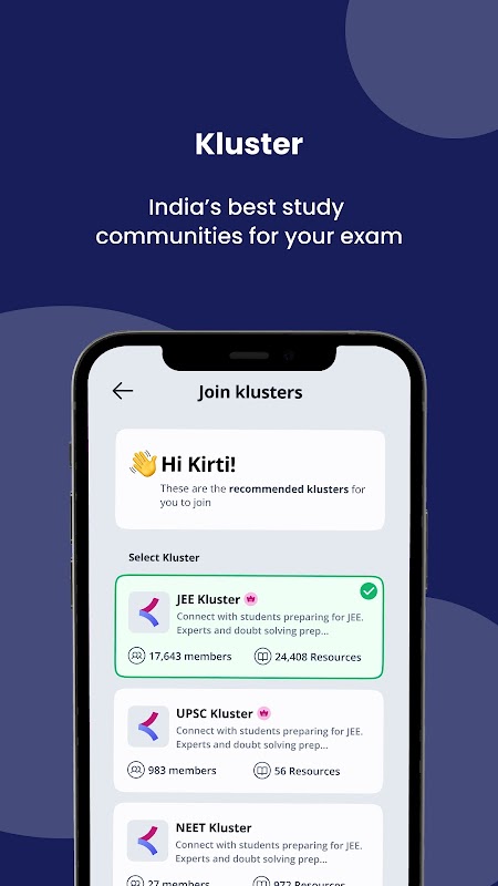 Kluster è la più grande piattaforma di comunità di apprendimento dell'India in cui puoi entrare in contatto con studenti con gli stessi obiettivi di apprendimento/esami e studiare insieme online in un ambiente produttivo, divertente e sociale.