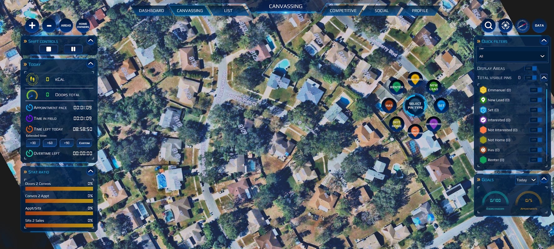 Il software D2D più avanzato con profili utente specifici personalizzati. Configura i piani KPI in base ai livelli di esperienza e agli obiettivi di reddito. Scolpire le aree. Dati del proprietario della casa, assegnazioni del territorio. Visualizza analisi in tempo reale come il tempo sul campo, l'attività, il monitoraggio (passi, calorie, disinance) e il ritmo (porte e appuntamenti all'ora)