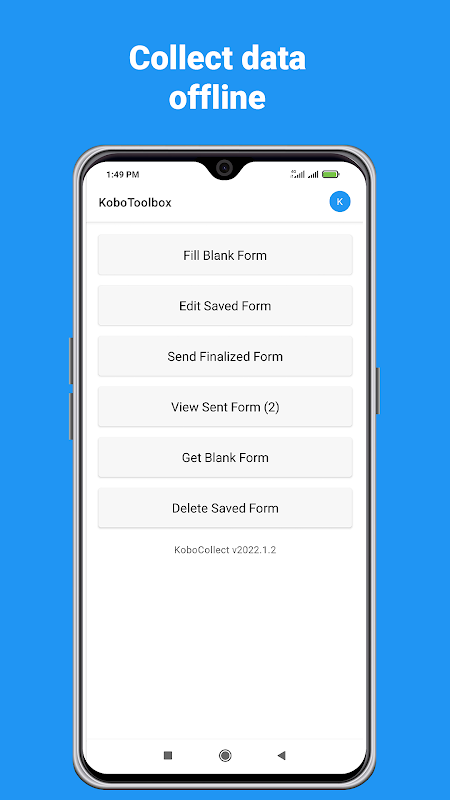 KoboCollect è l'app di immissione dati Android gratuita da utilizzare con KoboToolbox. Si basa sull'app open source ODK Collect e viene utilizzata per la raccolta di dati primari nelle emergenze umanitarie e in altri ambienti impegnativi sul campo. Con questa app inserisci i dati delle interviste o altri dati primari, online o offline. Non ci sono limiti al numero di moduli, domande o invii (incluse foto e altri contenuti multimediali) che possono essere salvati sul tuo dispositivo.