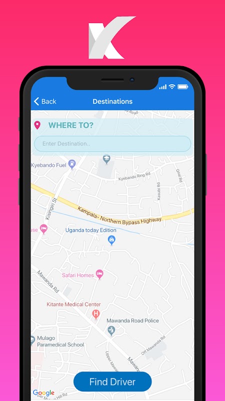 2. Imposta la tua destinazione, ad es. Entebbe, Kampala, Jinja, Mbarara, Gulu ecc