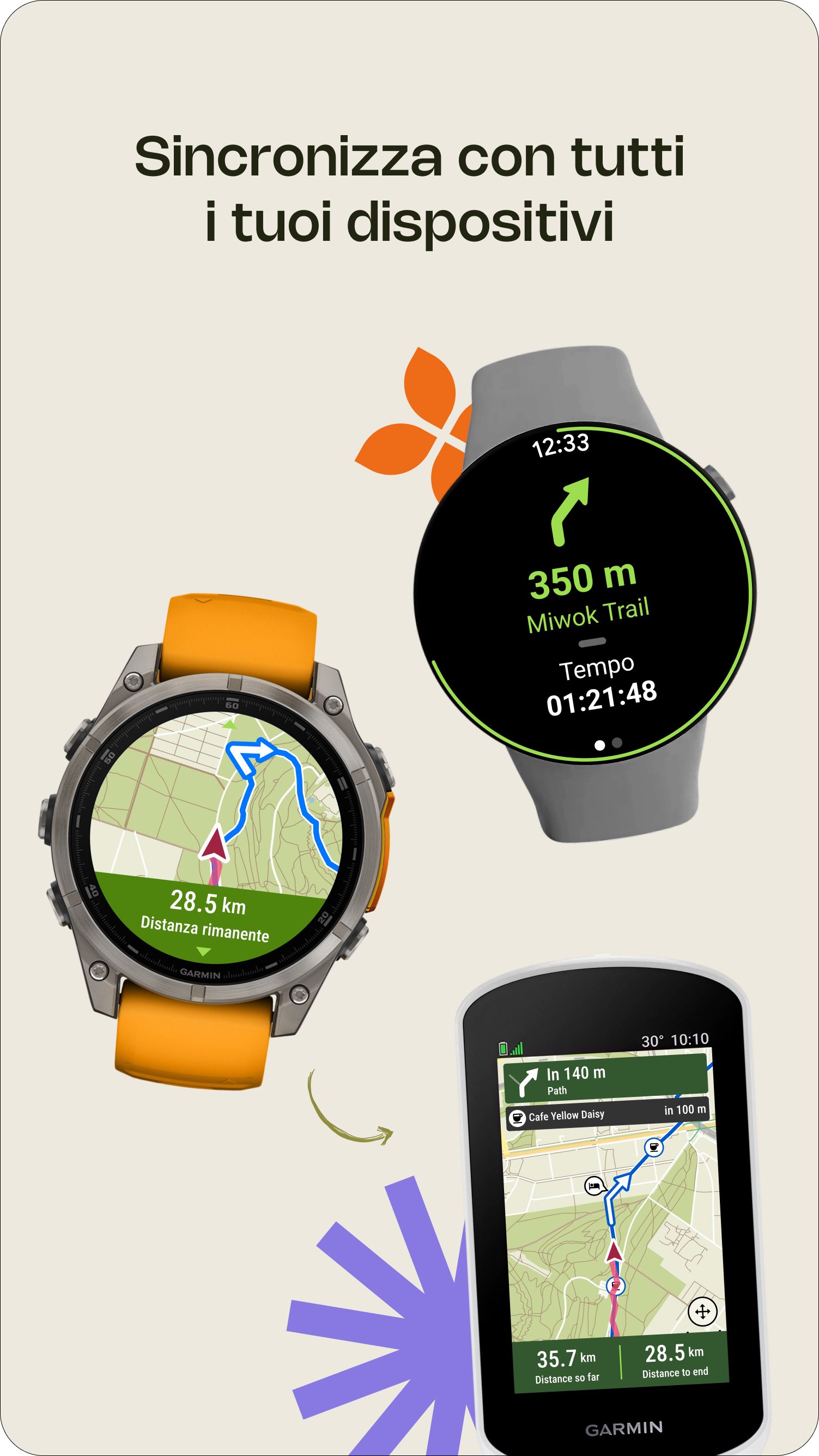 • Garmin - Scarica l’app komoot Garmin nell’IQ Store e sincronizza i tuoi account via Garmin Connect per condividere i tuoi percorsi komoot con il tuo dispositivo Garmin.