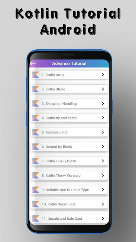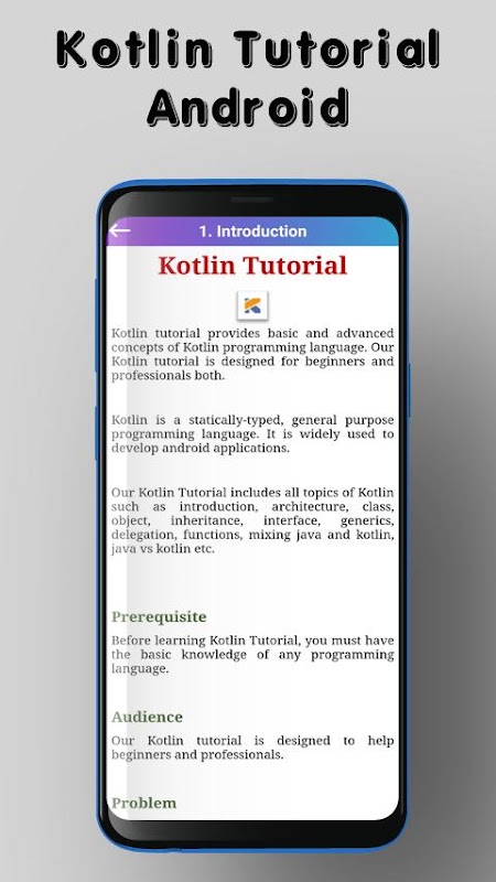 This (Learn Kotlin for Android) App is going to be your best friend. This app contains all the major topics of Kotlin Programming Language with Code Examples. With its beautiful UI and easy to learn guide you can learn the Kotlin Programming in few Days, and this is what make this app different from other apps. We are constantly updating this app with every new major Kotlin language release and adding more code snippets.