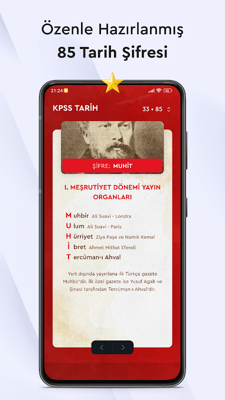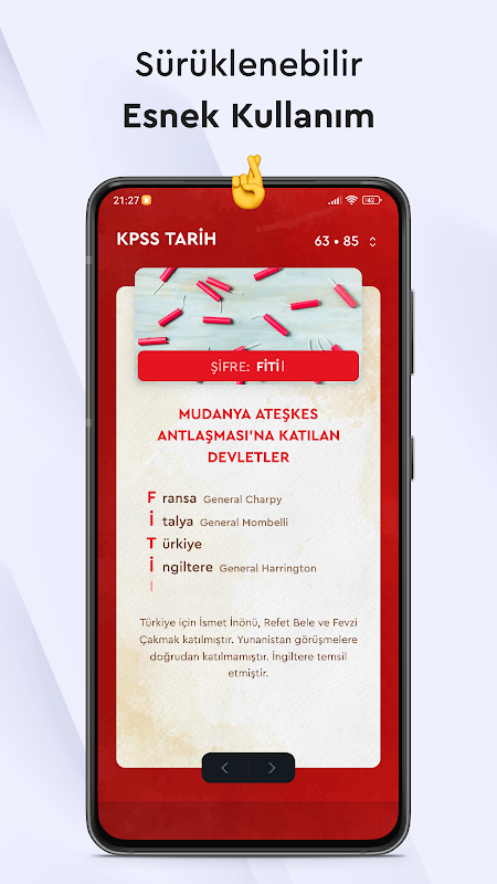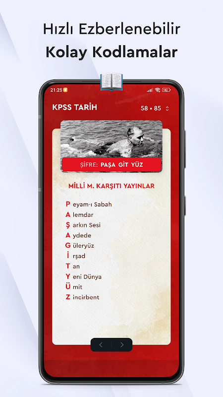 È abbastanza difficile leggere e memorizzare articoli lunghi su argomenti di storia KPSS. Con 85 codici preparati con cura, vedrai che potrai memorizzare facilmente informazioni che rimarranno nella tua mente durante tutti gli esami. Puoi imparare gli argomenti difficili che incontri durante le lezioni di storia molto più facilmente con la codifica delle foto.