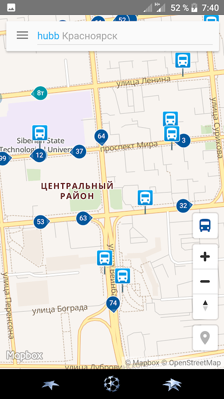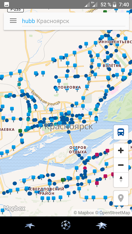 -приложение показывает в режиме реального времени транспорт оборудованный и с функционирующим GPS трекингом в городе Красноярске.