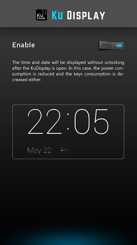 The operating principle of KuDisplay is that the time and date will be always displayed even during the black screen status after the screen is locked.