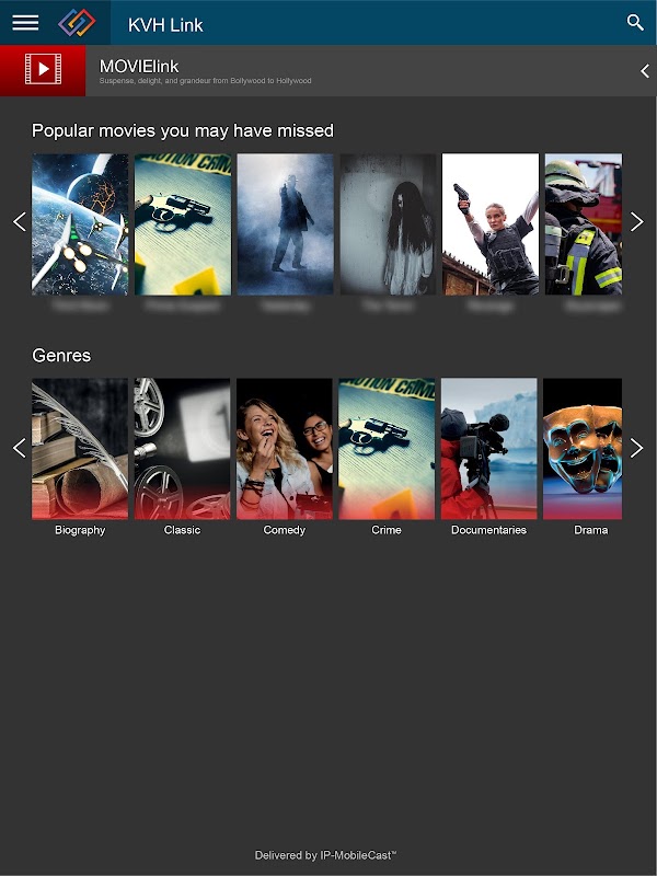 Dichiarazione di non responsabilità: l'app KVH Link visualizza contenuti multimediali proprietari solo quando utilizzata a bordo di navi mercantili che hanno stipulato un contratto di servizi con KVH Industries, Inc. ("noi"). Abbiamo ottenuto licenze per visualizzare tutti i contenuti multimediali forniti dai rispettivi titolari dei diritti sui contenuti. Quando connesso a Internet, l'app KVH Link è solo a scopo dimostrativo e mostra solo contenuti open source.