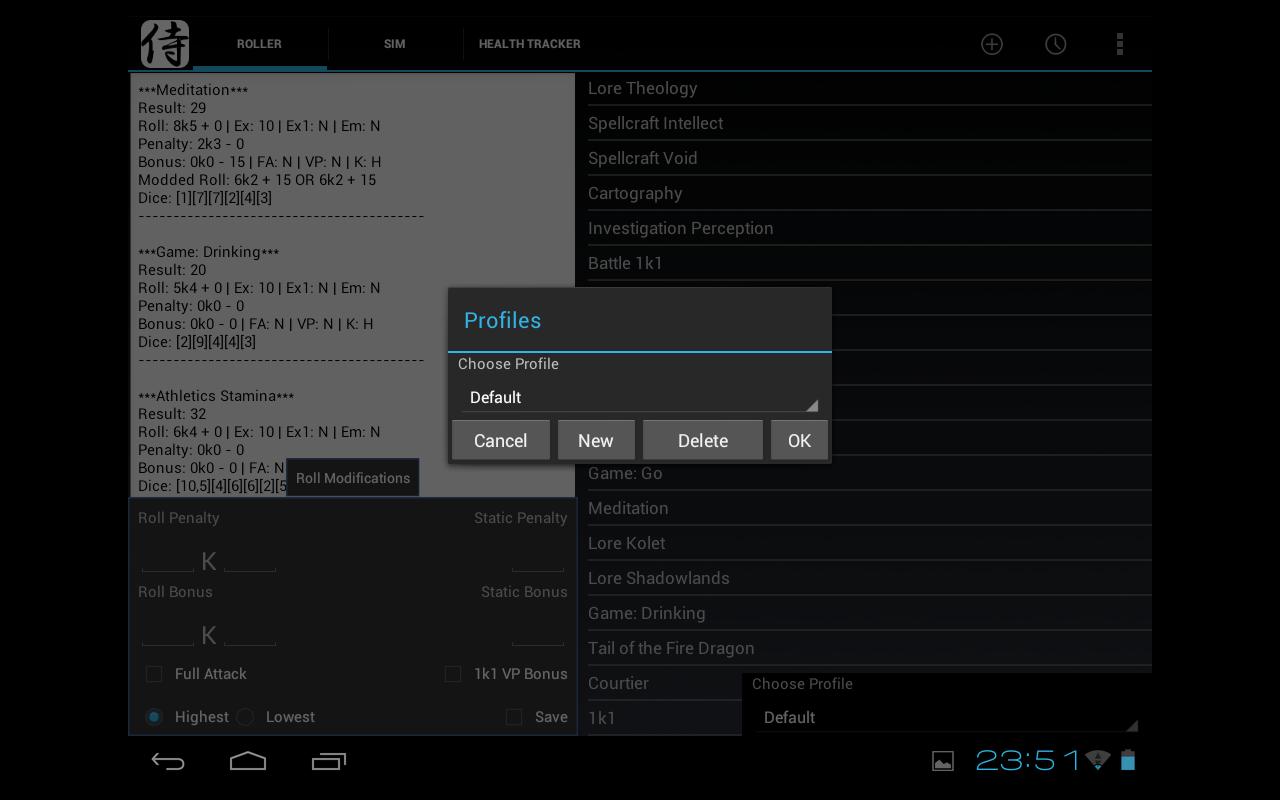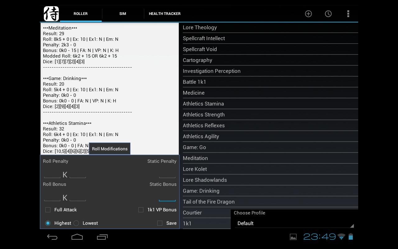 Questa applicazione è progettata per essere un rullo di dadi e un inseguitore di salute per la Leggenda dei Cinque Anelli gioco di ruolo. E 'stato dotato di strumenti per tutte le complessità di rotolamento che sono state incontrate finora nelle mie sessioni di gioco.