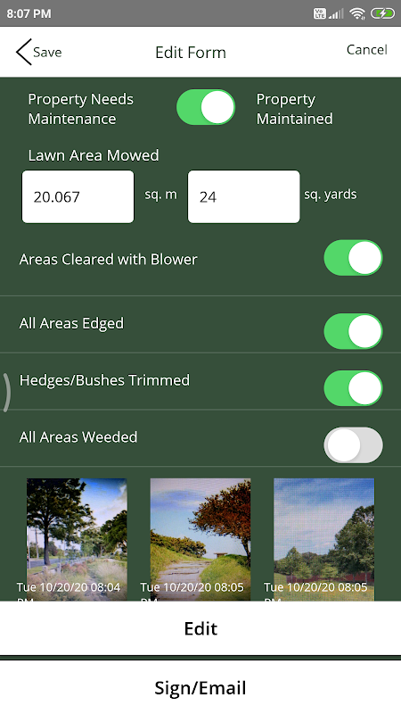 L'applicazione per la manutenzione del paesaggio fornisce una documentazione coerente e semplificata e un processo di approvazione per i lavoratori sul campo da utilizzare dall'inizio del lavoro fino alla conclusione. Sfrutta la tecnologia degli smartphone con il nostro processo di documentazione in attesa di brevetto e bloccato a tempo che include foto incorporate con filigrana con ora, data, temperatura ambiente e posizione GPS, oltre a ordinare, archiviare e inviare documenti tramite e-mail e consentire l'acquisizione della firma (E-Sign ) con sincronizzazione Cloud su più dispositivi (iOS).