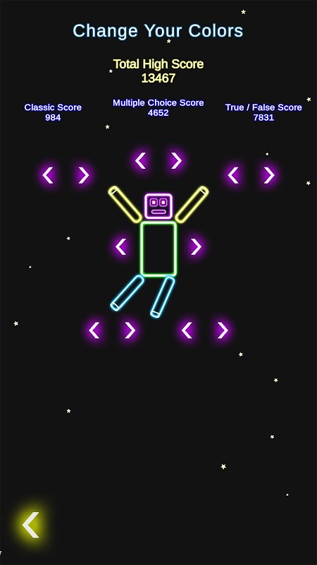 Devi tenere Neon Man lontano dal laser. Perché il laser scioglie Neon Man. Ma può rigenerarsi di nuovo. Se rispondi correttamente alle domande, farai combo e guadagnerai più punti. Inoltre puoi colorare Neon Man come desideri con i punti che guadagni.