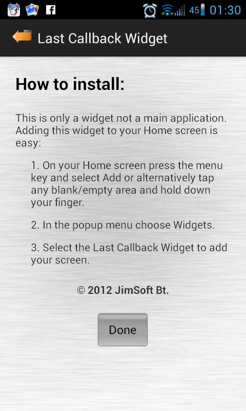 This is ONLY A WIDGET not a main application! You can add it by long pressing your homescreen -> than go to "Widgets" -> and choose "Last Callback Widget".