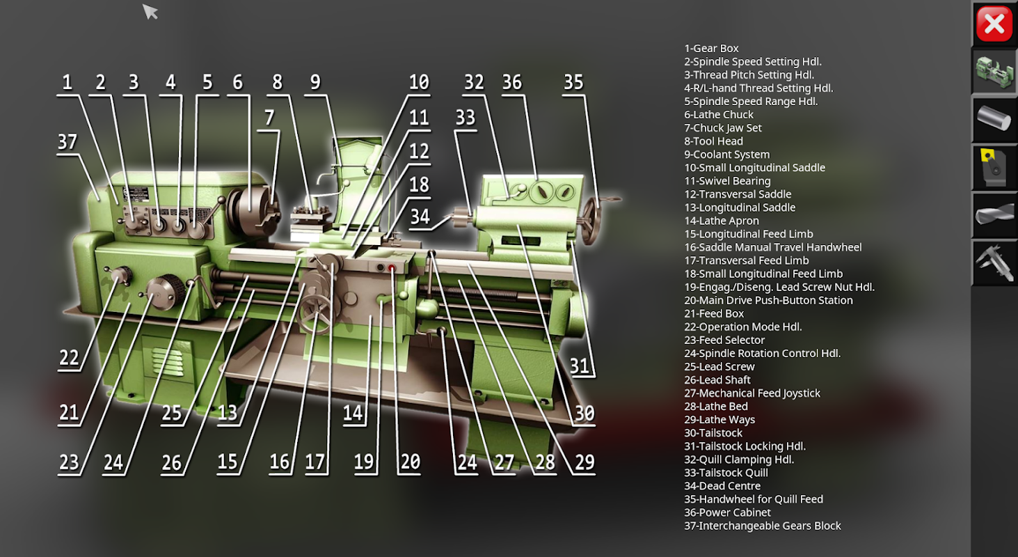 Simulatore 3D di un classico tornio a vite mod. 1K62. L'applicazione simula le prestazioni delle normali operazioni di tornitura in modalità interattiva. Le capacità del modello di simulazione comprendono operazioni di tornitura esterna e frontale, perforazione e alesatura di fori, tornitura di scanalature, taglio di filettature esterne e interne. Nella versione completa dell'applicazione, sono disponibili per il lavoro oltre 70 utensili da taglio. L'interfaccia utente grafica è realizzata in russo e inglese. Sono supportati i sistemi di misurazione metrica e pollici. La quantità richiesta di memoria video del dispositivo è di 350 MB. Il sistema grafico dell'applicazione utilizza i componenti di OpenGL 3.0.