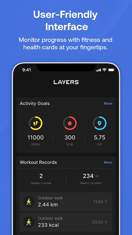 1. Visualizzazione dei dati sanitari: Layers Watch registra i dati rilevanti per la tua condizione fisica come passi effettuati, ore di sonno, frequenza cardiaca, calorie bruciate e SpO2, fornendo inoltre interpretazioni professionali su questi dati;