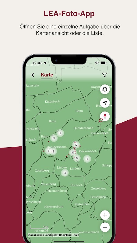 Se attraverso il monitoraggio satellitare non è possibile determinare un risultato chiaro, tu come utente registrato hai la possibilità di elaborare questo compito direttamente nell'app fotografica LEA. La visualizzazione della mappa facilita l'orientamento. È quindi possibile scattare diverse foto dell'area specifica. Queste foto aiutano a valutare la situazione.