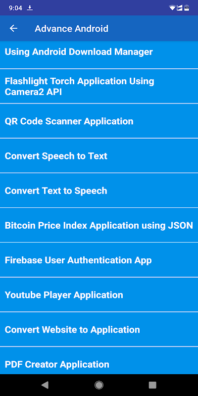 L'app è composta da tutorial, esempi di codice, demo e spiegazioni teoriche . Puoi imparare concetti di base sullo sviluppo di app Android, concetti ed esempi di sviluppo Android di livello principiante con codice e demo, funzionalità Android di livello avanzato con codice e demo, codici di app Android professionali con spiegazione e utili segmenti informativi con informazioni importanti su come diventare uno sviluppatore Android professionale e conoscenza di diverse cose importanti legate allo sviluppo di app Android. Inoltre abbiamo fornito 9 app professionali completamente sviluppate con tecniche di codifica di sviluppo Android avanzate che puoi acquistare e migliorare ulteriormente le tue abilità.
