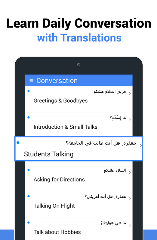 Conversazioni: Sezione dispone di alcune conversazioni di base una persona deve quotidiano in arabo.