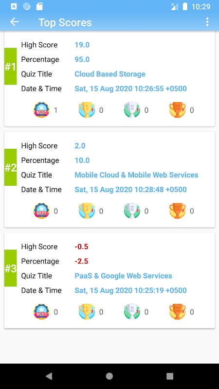 Dopo aver tentato un quiz MCQ, l'utente può visualizzare il rapporto di riepilogo con la ricompensa appropriata, rapporti dettagliati, i punteggi migliori con il numero di diversi premi vinti. L'utente può anche ripulire i rapporti del quiz, se necessario.