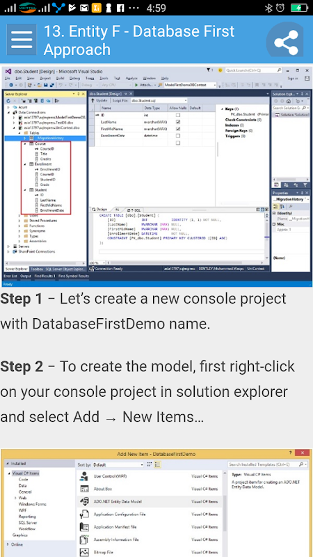 The Learn Entity Framework is designed for those who want to learn how to start the development of Entity Framework in their application.