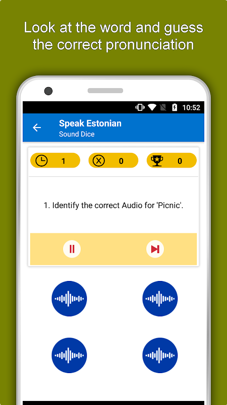 La linea Estonian apprendimento app ha 2.135 parole con 55 categorie. Contiene pronuncia, immagini fonetica delle parole per l'apprendimento facile. lingua switch di base, l'audio gioco, potpourri e ritenzione giochi sono le caratteristiche principali di Speak app estone.