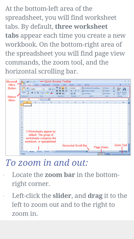 This app will guide you through the new features of MS Excel 2007 to help you easily learn Ms Excel and Practice any time.