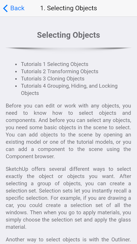 Selecting Objects, Selecting Objects with the select tool, Selecting Objects with menu Commands, Selecting Entities, Summary, Transforming Objects, Using the move tool, Using the Rotate tool, Using the scale tool, Summary, Cloning Objects, Using the Cut, Copy and Paste Command, Cloning with the Transform Tools, Summary, Grouping, Hiding and Locking Objects, Creating a Group, Working with Groups, Hiding and Un hiding Objects, Locking and Unlocking Objects, Summary