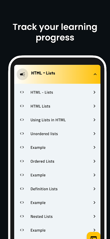 •Padroneggia l'HTML velocemente! Lezioni semplici, esempi reali e monitoraggio dei progressi all'interno.