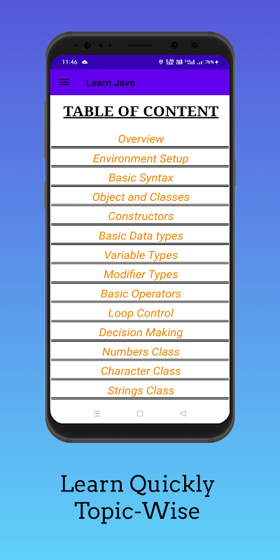 Java is a high-level programming language originally developed by Sun Microsystems and released in 1995. Java runs on a variety of platforms, such as Windows, Mac OS, and the various versions of UNIX. This app gives a complete understanding of Java. This reference will take you through simple and practical approaches while learning Java Programming language.
