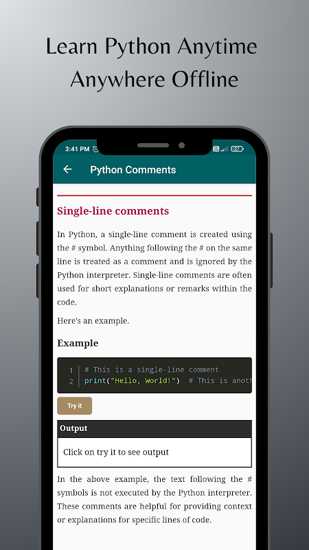 Impara Python da zero a eroe con questa app di apprendimento mobile completa! Che tu sia un principiante assoluto che sta muovendo i primi passi nel mondo della codifica o che cerchi una pratica risorsa offline per rispolverare i concetti chiave di Python, questa app fa al caso tuo.