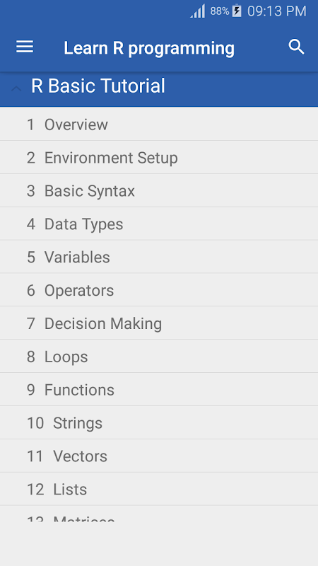 R is a programming language and software environment for statistical analysis, graphics representation and reporting. This App is designed for software programmers, statisticians and data miners who are looking forward for developing statistical software using R programming. If you are trying to understand the R programming language as a beginner, this App will give you enough understanding on almost all the concepts of the language from where you can take yourself to higher levels of expertise.