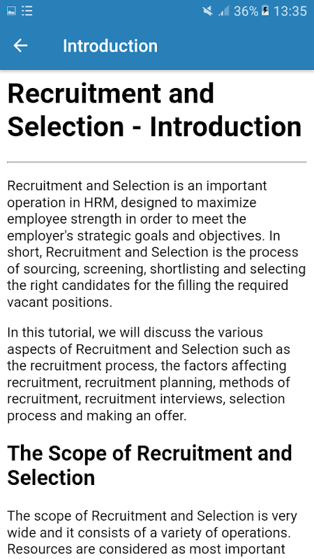 With this App you don't need internet connection to read and learn about Recruitment And Selection concept.
