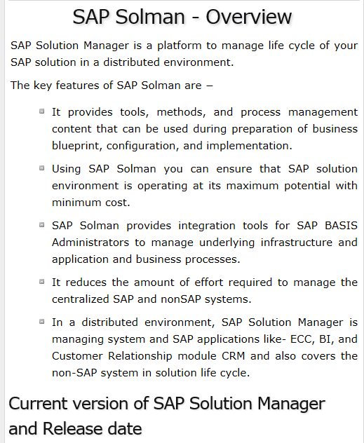 SAP Solman is a SAP product used to provide a centralized, robust solution management product that allows you to manage technical support in distributed environment. It covers all key functions like solution deployment, IT Service Management, Business and Application Operations and continuous maintenance and improvement. Using SAP Solman, you ensure that SAP solution environment is performing at its maximum potential with minimum cost.