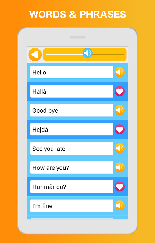Usando questa app per imparare lo svedese ricevi frasari che includono saluti, conversazione, numeri, hobby, alloggio, aggettivi, animali, colori, vestiti, nazioni, indicazioni, emergenze, cibo, difficoltà linguistiche, domande, frasi, modi di dire edaltre parole in svedese.